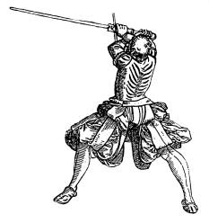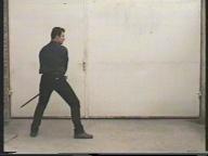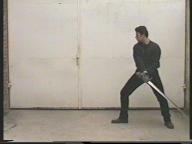 Das Schwert befindet sich auf der linken Seite, der Ort ist nach hinten in Richtung Boden gerichtet, die lange Schneide (der Hand abgewandt) ist nach vorne gerichtet.