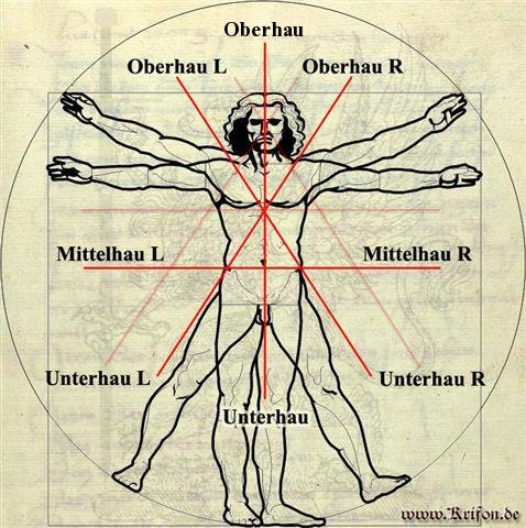 Im Langschwertfechten beinhalten die einfachen Hiebe auch eine Schnittkomponente. Somit ist für den Fechtschüler nicht nur wichtig wo er trifft, sondern auch welchen Weg dann seine Klinge zurücklegt! Um dies zu systematisieren und zu trainieren wurden damals diese Hiebe in drei Beriche unterteilt: