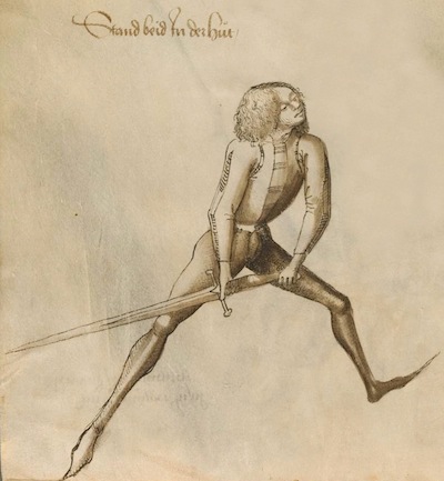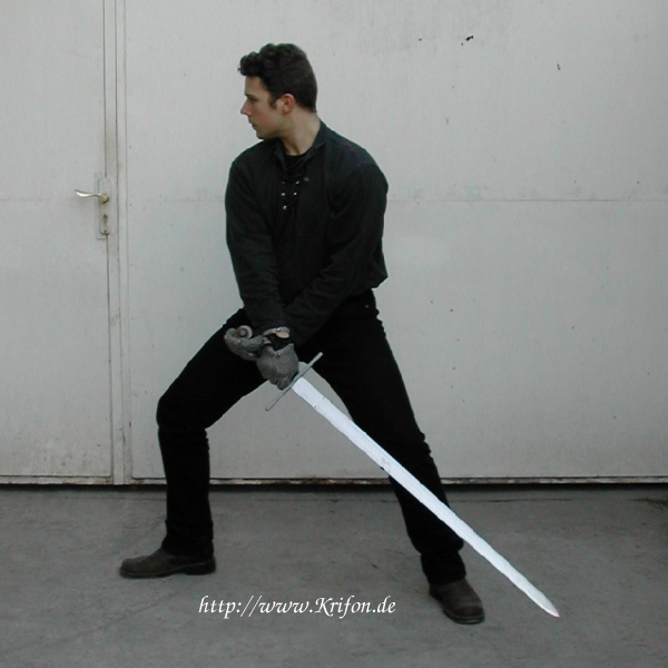 "IN dise Hut schick dich also / Stehe mit dem Lincken fuß vor / halt dein Schwerde neben der Rechten / mit der Spitzen auff der Erden / das der Knopff ubersich / und die kurtze schneid gegen dir stehe."