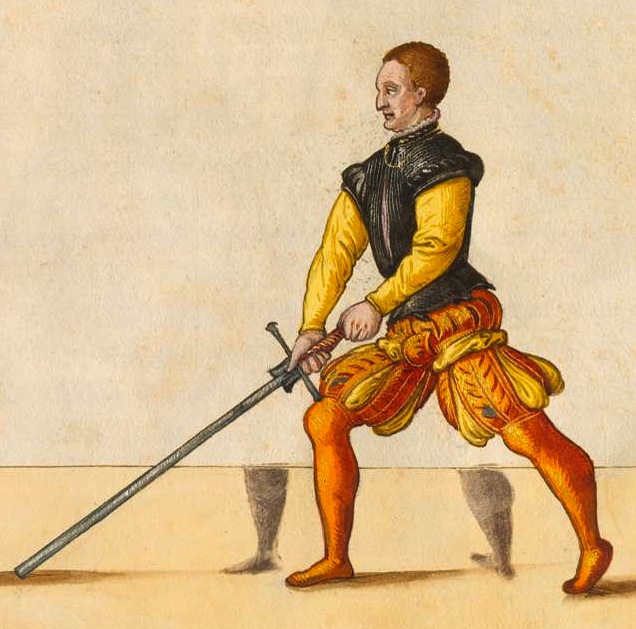 "stehe mit dem Lincken fuß vor / halt dein Schwerdt mit dem ort vor dir außgestreckt auff die Erden / fur deinen vorgesezten fuß / das die kurtze schneid oben / die Lange unden stehe"